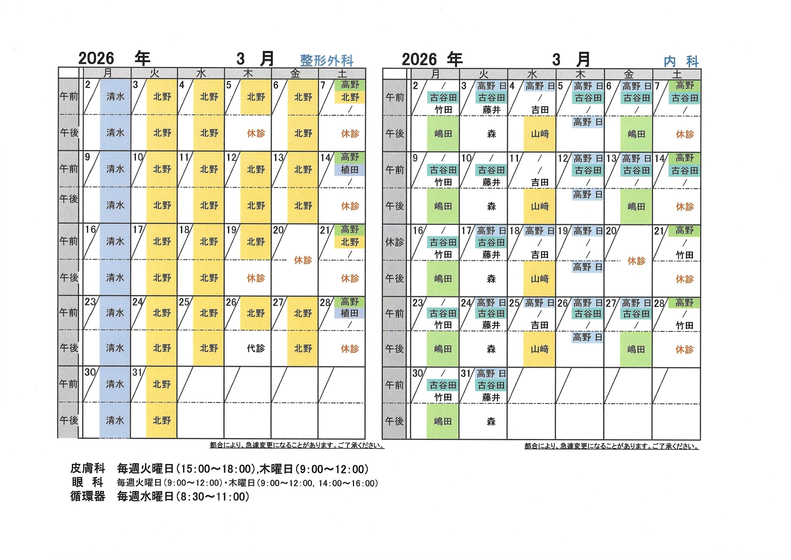 3月の担当医です。※急な変更もありますので、詳しくは受付までお電話ください。